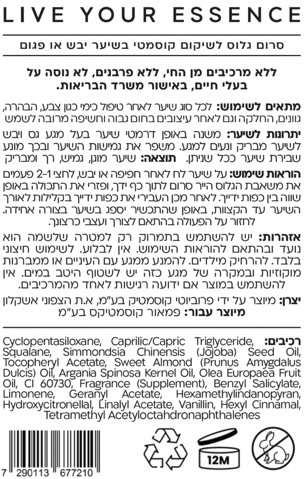 כן, ה- Gloss Hair Serum מיועד ומומלץ מאוד לשימוש על כל סוגי השיער. אם יש לך שיער טבעי ארוך ואת סובלת מקצוות יבשים, כנראה שתזדקקי רק למעט סרום באזור הקצוות. אם שיערך פגום מטיפול כימי (צביעה/הבהרה/גוונים/החלקות שיער), שהותיר בשיער מום בהגנה הטבעית שלו, יש למרוח את הסרום לאורך כל השיער. ה- Gloss Hair Serum מכיל את המרכיבים היעילים ביותר לטיפול והזנת השיער. *ככל שהשיער יבש יותר או פגום, כך מומלץ להעלות את מינון השימוש וכמות התכשיר.